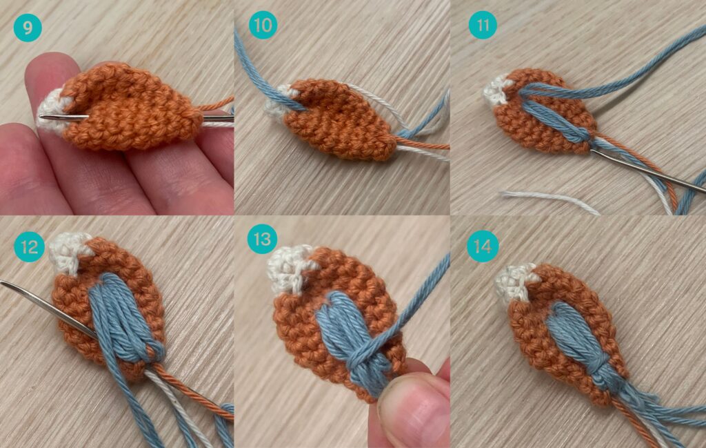 Kiristä korvien kärjet yhteen neulomalla parsinneulalla valkoisella langalla. Näin saat aikaiseksi korvan suipon muodon. Päättele valkoinen lanka korvan sisälle. Korvan turkoosi pinta tehdään kirjailemalla turkoosia lankaa parsinneulalla korvan tyvestä ylöspäin kunnes haluttu paksuus ja tiheys on saavutettu. Päättele turkoosi lanka korvan sisälle.