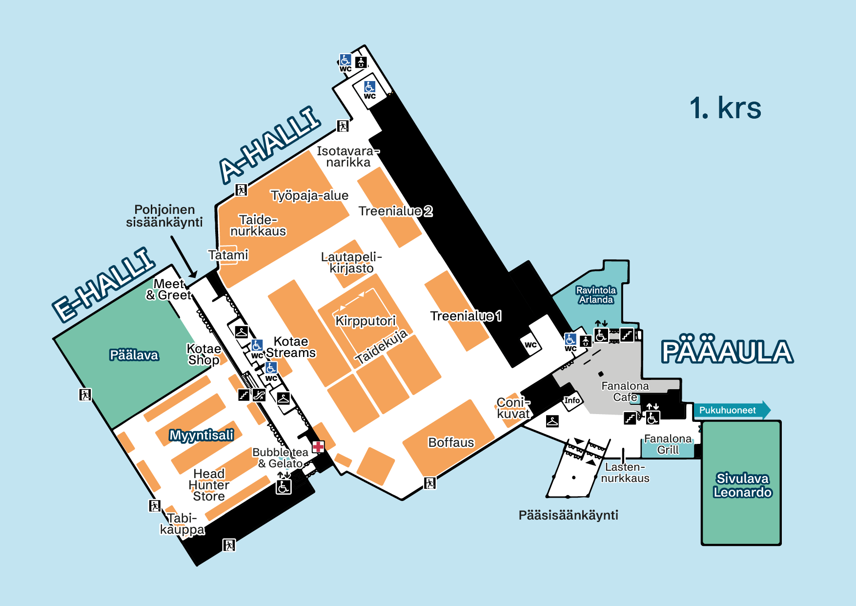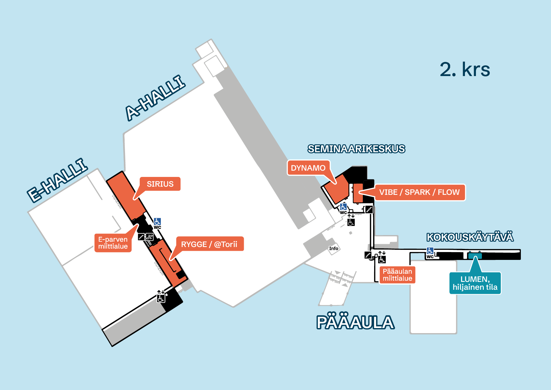 Evenemanget kommer att använda hallarna A och E, sidoscenen i hall D, samt seminariecentret, konferenskorridoren, Sirius och Rygge-anläggningarna på andra våningen. Vänligen se kartorna över lokalen i förväg längst ner på denna sida.
